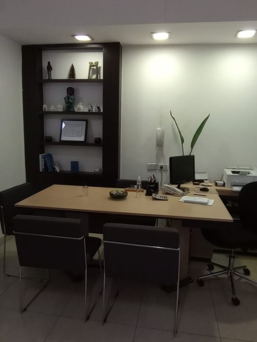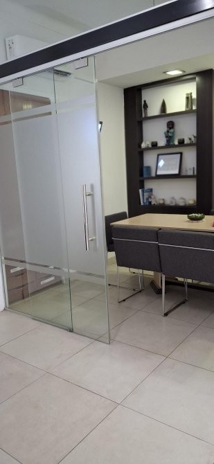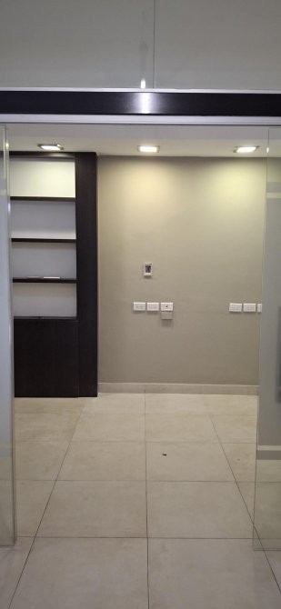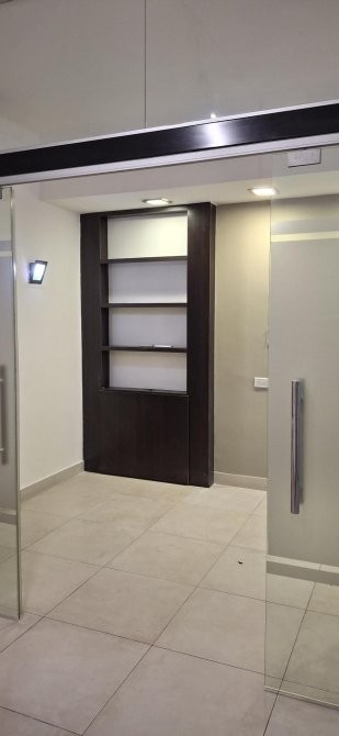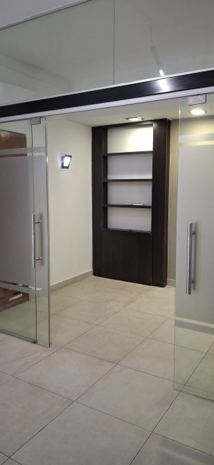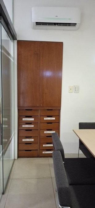 RECEPCIÒN , PRIVADO CON PUERTA CORREDIZA DE BLINDEX , CON BIBLIOTECA Y MUEBLE EMPOTRADO PARA ARCHIVOS .